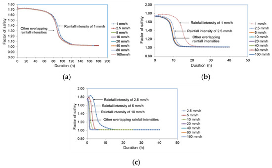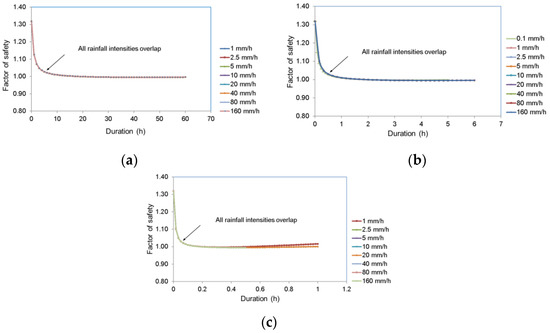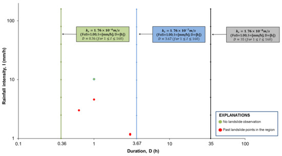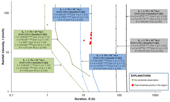In Figure 20 and Figure 21, it can be clearly observed how the hydraulic conductivity, rainfall intensity and duration affect the I-D thresholds. Decreases in the saturated hydraulic conductivity shifted the rainfall intensity–duration thresholds to the right for both initial conditions. It is also observed that a longer duration of rainfall with the same rainfall intensity was required to trigger the landslide, as the saturated hydraulic conductivity of soil decreased. Rainfall thresholds were obtained as approximately vertical lines for the saturated hydraulic conductivity of 1.76 × 10−8 m/s in the dry-period initial conditions and as vertical lines for all saturated hydraulic conductivities in the wet-period initial conditions (see Figure 20 and Figure 21). This is due to the overlapping of the factor of safety curves given in Figure 18 and Figure 19 for the mentioned rainfall intensities and hydraulic conductivities.