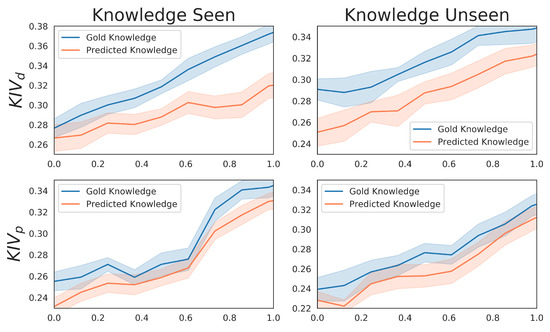- : We use to measure the engagement of knowledge. To assess whether the knowledge is articulated diversely and engagingly, we define a unique automatic metric that measures the ratio of knowledge utilization in responses based on the word overlap between responses and provided knowledge. We initially compute as the average BLEU score, considering the generated response as the hypothesis and given knowledge as the reference. An exceptionally high signifies an excessive copy of external knowledge and makes the response less engaging. We further consider of the gold standard response created by human y as the ground truth and compute the average absolute difference between and , namely , to measure the engagement of knowledge:where N is the number of samples in the test set, y and are gold and generated responses from the same context and knowledge. A lower indicates a closer knowledge copy ratio of generated responses to ground truths, showing better knowledge engagement.