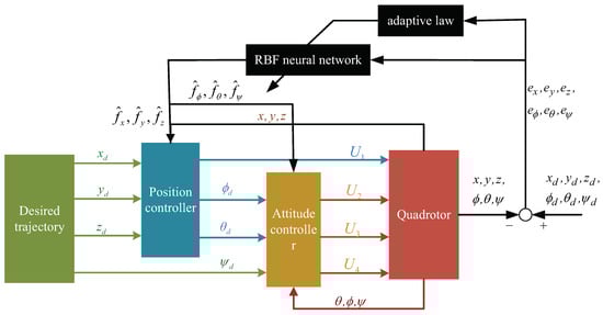 27], an adaptive command filtered backstepping sliding-mode control scheme was proposed for finite-time tracking control of quadrotor UAV systems. An adaptive control strategy was applied to estimate the upper bounds of the model uncertainties and external disturbances. Radial basis function (RBF) neural networks, which have good ability to approximate unknown functions, are widely used in nonlinear robust control system design [