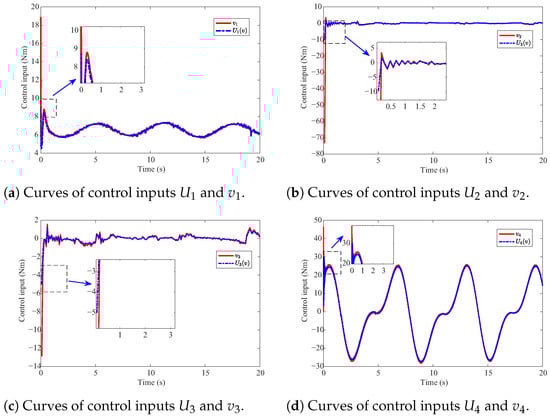 Figure 9a–d. The UAV control system is a typical nonlinear system. As the control input is limited by physical factors, the control intput will show input saturation. To verify the effectiveness of the anti-saturation strategy, the control input without anti-saturation strategy and the control input with anti-saturation strategy are simulated for comparison. It can be seen that the control intput of each channel is always within the set constraints under the anti-saturation strategy. Control inputs without anti-saturation processing will be too large or too small at first. With the anti-saturation processing, the control intput is strictly limited to a constrained range and still has good tracking performance.