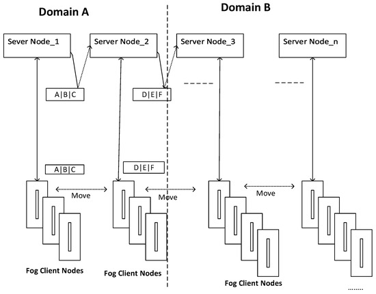 Our system model has domains—Domain A, Domain B, etc. Each domain may have many server nodes (ServerNode_1, Server Node_2, etc.) connected with many mobile fog client nodes (Fog Client Node_1, Fog Client Node_2, etc.). The fog client nodes can move and connect with any server node within the same domain and the fog server within the neighbor domain.