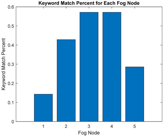 The workload includes the processing tasks and data transfers needed in the network. Once the information has been gathered, it can be used to create a model of the fog computing network using the simulation tool. The model should accurately represent the network, including the devices, nodes, and communication links, and should be able to accurately simulate the processing tasks and data transfers in the network. This is critical to the simulation results’ accuracy and the ability to optimize the network based on the simulation results. Figure 3 shows the keyword match percentage in the proposed keyword-based scheme for fog computing. The horizontal axis shows the keyword index, and the vertical axis shows the match percentage. Each bar represents the match percentage of a specific keyword in the search query. The bar height represents the match percentage ranging from 0 to 100%. The figure shows that some keywords have a higher match percentage than others, indicating that they are more relevant to the search query. Figure 4 shows the keyword match and trust scores in the proposed keyword-based scheme for fog computing. The horizontal axis shows the keyword index, and the vertical axis shows the match or trust score. Each bar represents the score for a specific keyword in the search query. The height of the bar represents the score, which ranges from 0 to 1. The figure shows that some keywords have a higher match or trust score than others, indicating that they are more relevant to or trustworthy for the search query. The match and trust scores can be used to rank the search results and provide users with more accurate and reliable information.