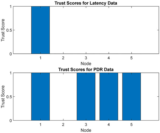 Figure 9 shows the trust scores for two different parameters: latency and packet delivery ratio (PDR). The x-axis represents the different trust score levels, while the y-axis shows the percentage of samples within each trust score level. The blue line represents the percentage of samples that fall within each trust score level for the latency parameter. In contrast, the orange line represents the percentage of samples that fall within each trust score level for the PDR parameter. The plot shows that the trust score distribution for the two parameters is different. Most samples fall within the lower trust score levels for the latency parameter, indicating that the latency values are generally higher and less reliable. Most samples fall within the higher trust score levels for the PDR parameter, indicating that the PDR values are usually better and more reliable.