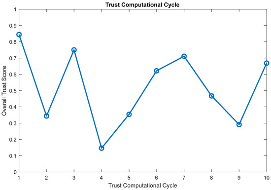 Conversely, as the latency values decrease, the PDR values increase, indicating that packets are more likely to be delivered successfully. Figure 10 visually represents the relationship between two important performance metrics, highlighting their trade-offs. It can be a helpful tool for understanding the performance characteristics of a system and identifying areas where improvements or optimizations may be needed. Figure 11 shows the computational trust cycle. The x-axis represents the different stages of the cycle, while the y-axis shows the level of trust associated with each stage. Each data point represents a specific measurement taken during the simulation. The plot shows several stages in the trust computation cycle, including trust calculation, update, and decision. The level of trust associated with each stage varies, with some stages having higher levels of trust than others. Figure 11 visually represents the computational trust cycle, highlighting the stages of building and maintaining trust in a system. It can be useful for understanding a system’s trust dynamics and identifying areas where improvements or optimizations may be needed.