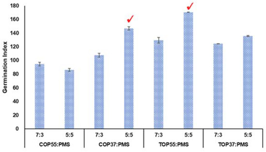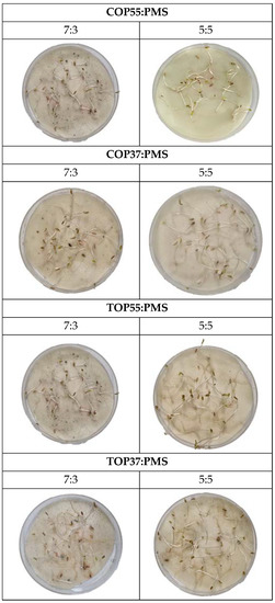 Figure 2, all the soil modifiers, except the one prepared by mixing 50% paper mill sludge with a 5:5 mixture of camellia oilseed cake and peat moss (COP55:PMS = 5:5), exhibited a GI over 100. This finding suggests that the mixtures of PMS with camellia oilseed cake (CO) and peat moss (P), as well as with oilseed cake of toothache tree (TO) and peat moss (P), hold promise as potential biostimulants for enhancing seed germination. Importantly, these mixtures were found to be safe for use, as they did not negatively affect seed germination. Moreover, it is worth noting that an increase in the amount of paper mill sludge (PMS) added to the mixtures of COP and TOP resulted in a higher germination index. This observation suggests that PMS contains organic matter and essential nutrients that can enrich the soil. Undurraga et al. reported no acute or subacute toxic effects on seed germination when PMS prepared as pellets was applied to soil [