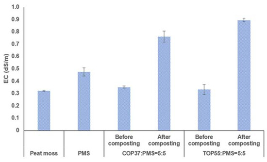 p-values less than 0.05. Additionally, the presence of PMS, initially exhibiting a higher EC of 0.5 dS/m, likely contributed to the overall increase in EC values. Nevertheless, the values obtained for both mixtures remained within the acceptable range of soil EC (0.5–3 dS/m). Therefore, it is reasonable to conclude that the composted soil modifiers, including PMS, would not significantly impede plant growth.