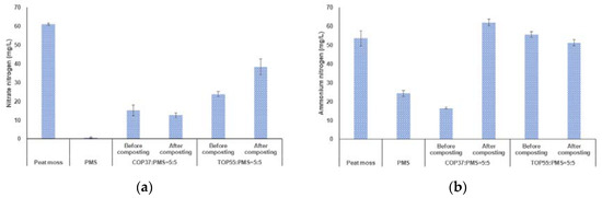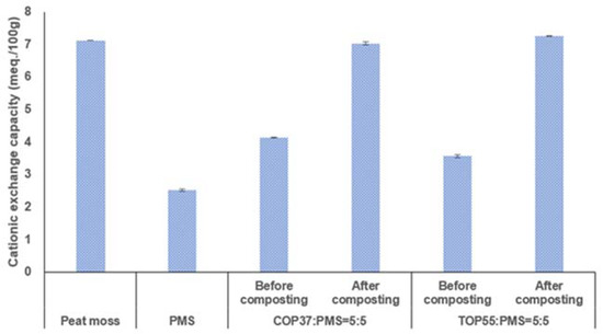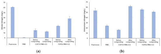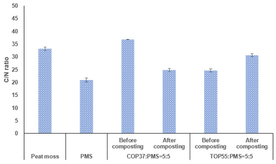 43]. This indicates that the mixtures of COP37/PMS and TOP55/PMS were well-balanced in the carbon-to-nitrogen ratio before and after composting. The COP37/PMS mixture initially showed an increased C:N ratio before composting, but this decreased afterward, suggesting an increase in nitrogen availability. Conversely, the C/N ratio of the TOP55/PMS mixture showed minimal differences before composting, and the impact on the ratio remained minor after composting. Therefore, managing the C:N ratio of any soil modifier added to the soil is crucial for optimizing nutrient cycling and preventing nitrogen starvation. Finally, if the prepared soil modifiers have a high carbon-to-nitrogen (C/N) ratio even after composting, mixing them with high-C:N ratio materials such as nitrogen-rich sources like manure or compost can help maintain an optimal C:N ratio. This promotes efficient decomposition and enhances nutrient availability for plant uptake.