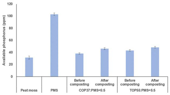 40]. Furthermore, the phosphorus levels in both mixtures experienced a further increase after the composting process. Composting, as a method of decomposing organic materials, enhances the nutrient content of the resulting soil amendment. These findings indicate that the composting process for the newly prepared soil modifiers with PMS enhanced phosphorus availability, which improved plant growth.