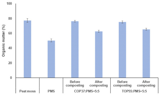 Figure 6 shows the changes in the organic matter content of the soil modifiers before and after the composting process. Peat moss had an organic matter content of approximately 80%, whereas PMS contained approximately 50% organic matter. Organic matter in PMS can improve soil fertility by enhancing soil structure, water-holding capacity, nutrient availability, and microbial activity, leading to improved plant growth [