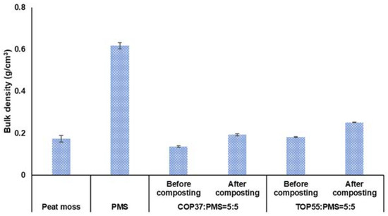 Figure 9 presents a comparison of the bulk density of the prepared soil modifiers before and after composting. After composting, the bulk densities of the COP37/PMS and TOP55/PMS mixtures increased by approximately 46% and 39%, respectively. However, it should be noted that the bulk densities of both COP37/PMS and TOP55/PMS exceeded the recommended range for soil, which typically falls between 1.3 and 1.5 g/cm
