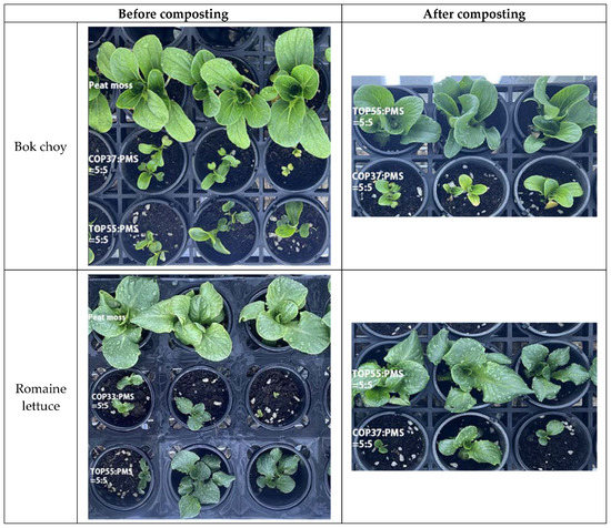 After composting, both vegetables planted in the representative mixtures of COP37/PMS and TOP55/PMS showed faster germination and growth rates than before composting. However, even after composting, COP37/PMS exhibited a slower growth rate than TOP55/PMS, as evidenced by