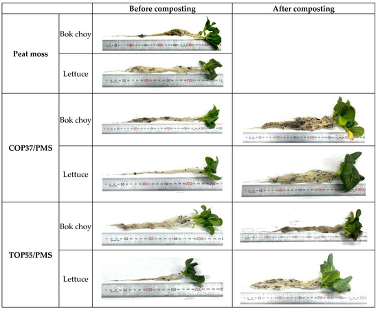 Figure 11, which illustrates the lengths of the roots and leaves of bok choy and romaine lettuce grown in the prepared soil modifiers before and after composting. Regardless of the vegetable types, COP37/PMS and TOP55/PMS showed longer roots and broader leaves after composting, but TOP55/PMS contributed to a better growth rate than COP37/PMS. In terms of soil properties, TOP55/PMS did not show significant differences from COP37/PMS in pH, EC, CEC, organic matter, available phosphorus, ammonia nitrogen, C/N ratio, and bulk density after composting. However, TOP55/PMS contained more nitrate nitrogen than COP37/PMS, which was considered to have greatly contributed to vegetable growth (refer to