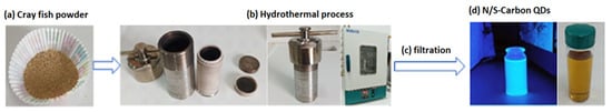 In the field of carbon QDs synthesis, a variety of preparation methods are used, which can be divided in two categories: (i) top-down and (ii) bottom-up [7,21]. Top-down methods require higher temperatures and pressures, whilst bottom-up methods are performed in milder conditions. Top-down methods operate by breaking down larger carbon structures to form the dots [22], while bottom-up methods focus on converting small, carbon-rich biomolecules into Carbon QDs [7,22]. Top-down preparation approaches includes arc discharge and laser ablation, which are quick, but result in a low quantum yield (QY) and poor size control. Additionally, electrochemical carbonization is performed in a single step and provides good size control, but is not suitable for many precursors [5]. Some commonly known bottom-up synthetic routes are microwave irradiation, which is quick and cost-effective but provides little control over the dots’ sizes; ultrasound; conventional heating; and hydrothermal/solvothermal treatment [7]. In this research, the hydrothermal route was followed because of the low cost, eco-friendliness, and non-toxicity, so it can be easily used on biomass-based raw materials such as crayfish shell. Previously synthesized Carbon QDs using this method have a diameter of 1.5 to 4.5 nm [5].