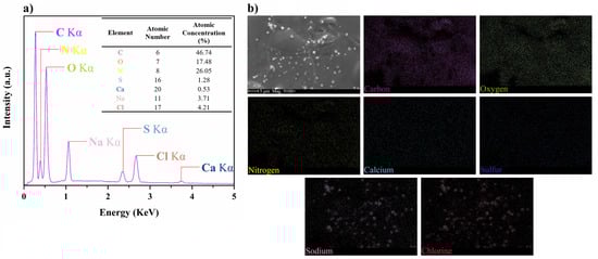 SEM-EDS analysis and surface mapping were performed on the low-magnification image of the chromium-sputtered sample in order to elucidate the surface elemental composition of the N/S-Carbon QDs. The results (Figure 3) showed that the surface structure of N/S-Carbon QDs is mainly composed of carbon, oxygen, and nitrogen atoms while sulfur atoms were found to be present although at a low concentration. Interestingly, according to the same results, calcium is also present on the surface of the material in a very low atomic ratio. This finding is in agreement with the aforementioned XRD results, confirming the existence of residual calcium particles in the material after synthesis, which could be attributed to the calcium content of the precursor (crayfish shells). Additionally, the white-colored endogenous particle spots appear to be sodium chloride particles since the elemental mapping showed that both sodium and chlorine atoms are the only ones present in these areas while the rest of the aforementioned atoms are absent. Moreover, the fact that their atomic ratios were found to be quite close further confirms the above claim.