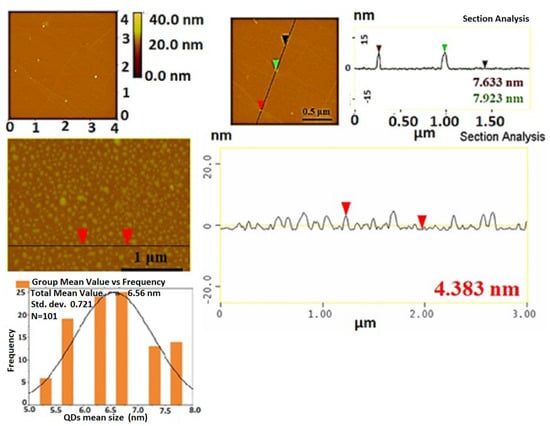 AFM images (Figure 4) show that N/S-Carbon QDs are spherical, with a diameter varying between 5 and 8 nm (average size = 6.56 nm), thus confirming their “quantum” morphology. In particular, N/S-Carbon QDs were found to have thicknesses of 5.362, 7.633, 7.923, and 8.026 nm, which were higher than the average of 3 nm recently reported for N-doped Carbon QDs [13].