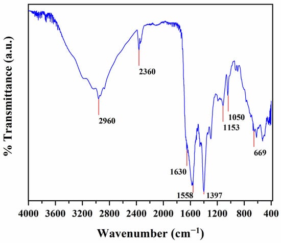 The ATR-FT-IR spectrum of N/S-Carbon QDs is presented in Figure 5. As can be observed, the characteristic peak at 2960 cm−1 is assigned to the stretching vibration of C-H bonds [28,31], while the broad band between 3000 and 3500 cm−1 confirms the presence of O-H and/or N-H bonds (bending vibration) [31,32]. Additionally, the peak at 669 cm−1 is assigned to the stretching vibration of N-H bonds while the sharp peak at 1397 cm−1 is related to the stretching vibration of C-N bonds [31,33]. The peak at 1630 cm−1 is attributed to the double bond vibration of C=O as well as C=C [31,33,34] while the peak at 1558 cm−1 corresponds to the stretching vibration of the N=O double bond [31,33,34]. Lastly, the bands at 1050 cm−1 and 1153 cm−1 are related to the stretching vibrations of C-O and C-S groups [31] and the band at 2360 cm−1 is observed as a result of the stretching vibration of the S–H bond thus confirming further the presence of sulfur. Overall, the ATR-FT-IR results are in agreement with the data obtained from EDS analysis as they confirm the presence of carbon, oxygen, nitrogen, and sulfur in the N/S-Carbon QDs structure and are consistent with previous reports [31,32,33,34].