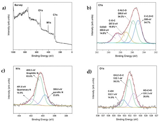 XPS studies (Figure 6a), such as EDS, revealed that the surface of N/S-Carbon QDs is mainly composed of carbon (76.2%), oxygen (9.9%), and nitrogen (13.9%). However, the atomic concentrations of those elements differed significantly between the results of those two techniques, which could be attributed to the fact that EDS focuses only on a relatively small area/particle of the material while XPS is employed to analyze a much larger, bulk quantity.