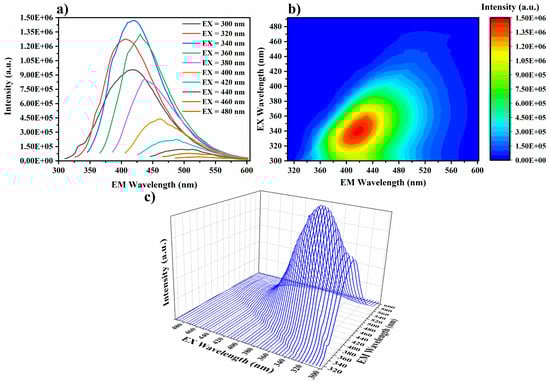 Fluorescence spectroscopy results (Figure 8a) revealed that when the N/S-Carbon QDs are excited at λEX = 300 nm they emit at λEM = 418 nm. From Figure 8b,c, it becomes evident that as the excitation wavelength increases, so does the intensity of the emission peak, with the emission wavelength showing little to no variation. However, after λEX = 340 nm, the intensity of the emission peak starts to gradually decrease. Furthermore, as the excitation wavelength increases beyond this point, a shift in the emission peak to higher wavelengths is observed, which is a phenomenon known as red shift [39]. Therefore, for λEX > 340 nm, the emission wavelength of N/S-Carbon QDs appears highly dependent on the applied excitation wavelength. These results are in agreement with the findings of other photoluminescence studies on crayfish-derived CQDs, according to which the emission wavelength and the emission intensity depend on the emission wavelength [40]. This photoluminescence behavior of the N/S-Carbon QDs could be the result of the differences between the material’s particle sizes and the surface defects caused by the presence of various functional groups [40].