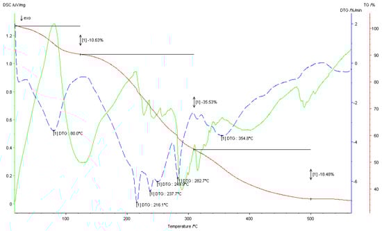 Figure 9 depicts the thermogravimetric (TG) and differential scanning calorimetry (DSC) analyses of the obtained N/S-Carbon QDs. The TG curve displays two mass loss steps. The first is an endothermic process that starts at 50 °C and ends at 150 °C, corresponding to the evaporation/desorption of water molecules. The second starts at 200 °C and ends at 500 °C and consists of several exothermic processes that are related to the thermal degradation of the different moieties of the material [41]. Based on the differential TG (DTG) curve, discrete peaks were recorded at about 216, 238, 250, 264 and 355 °C. As a result, the prepared N/S-Carbon QDs show good thermal stability regarding their applicability under common environmental and storage conditions.