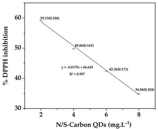 In Figure 11, the values of % DPPH radical inhibition calculated from Equation (2) are plotted as a function of N/S-Carbon QDs concentration. From the plotted values, the linear Equation (3) was fitted. From Equation (3), the effective concentration of aqueous N/S-Carbon QDs (EC50) solution that decreases the [DPPH•] concentration by 50% was calculated as equal to 4.14 mg L−1 or 4.14 μgmL−1. This value is much lower than the EC50 values reported previously for other carbon QDs [41,42,43,44] and implies a superior antioxidant activity of the obtained N/S-Carbon QDs. The [DPPH•] antioxidant activity mechanism is reported to act through [DPPH•] quenching by hydrogen atom transfer from the carboxyl, hydroxyl, and/or amino groups located in the surface of N/S-Carbon QDs [42,45]. In our case, it is suggested that the mechanism of [DPPH•] quenching by the hydrogen atoms of N/S-Carbon QDs is boosted further by the presence of calcium atoms. This significant antioxidant activity of obtained N/S-Carbon QDs indicate the potential use of such QDs in food preservation applications.