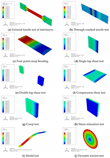 The simulation of the stress relaxation tests was carried out referring to [37]. The specimens were made of 10 mm-thick glass plies bonded by 1.52 mm-thick PVB interlayers, with a shear area of 100 × 100 mm on each side. The load of 25 kN was applied horizontally at the center of the middle glass ply to reproduce the shear stress of around , while the other sides of the other two outer glass plies were fixed. The time history of the load was captured. The simulation results show the homogeneous stress distribution in the interlayer, with a variation of 2% (Figure 1h). Through such tests, the master curves can be built to evaluate the long-term mechanical behavior of interlayers.