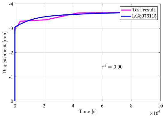 Experimental tests were conducted according to EN16613—Annex A [24] under the four-point bending configuration (Figure 2). The laminated glass plates were manufactured by two float glass plies (thickness 8 mm) with PVB interlayer (thickness 0.76 mm), with the size of and (Figure 2) and total thickness . The distance between the central lines of supporting rollers was , and the distance between the central lines of upper bending rollers was 200 mm. The tests (3 specimens) were conducted at a room temperature of 20 °C. A dead load () of 1150 N was applied for 24 h, while the midspan displacement was measured with an LVDT, continuously acquiring with a sampling rate of 50 Hz for the first 20 min and then with a sampling of 5 Hz (Figure 2). Figure 3 shows the time-displacement curve, which was used to validate the numerical model in Section 3.2.3. According to standard prescription, the response of the specimen which exhibited the maximum displacement was considered.