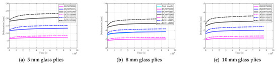 Figure 4 shows the time history of deformation of the LGs in the range of 0–86,400 s, obtained experimentally (magenta line) and numerically (blue line). The deformation of the specimen increases slowly from 3.04 to 3.65 mm during the whole simulation. The deformation tends to be constant over 65,000 s. The quantitative comparison in Figure 3 shows a very good correlation (coefficient of determination ) for the experimental and numerical time-deflection histories. Therefore, the numerical model can well describe the experimental response with time of the tested plates. Based on this numerical model, an investigation of the influence of the glass thickness, the interlayer thickness, and the loading scenario on the bending creep behavior was carried out.