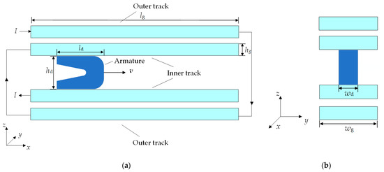 Schematic diagram of electromagnetic track launcher. (a) Side view of the launcher; (b) front view of the launcher.