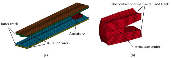 Electromagnetic launch technology is a new concept for an acceleration method that has been rapidly developed in recent years. Due to the technical advantages of fast speed, high efficiency, rapid start and good reliability, it has a wide application prospect in both military and civil fields [1,2]. Electromagnetic launch technology can be divided into the electromagnetic ejection technology, electromagnetic pushing technology and electromagnetic track launch technology according to the launch length and acceleration degree [3]. So far, the electromagnetic track launch technology is regarded as one of the effective means to enhance the tactical combat capability of conventional weapons in the future. Owing to good development prospects and technical advantages, it is an important research direction in the field of electromagnetic launch. An electromagnetic track launcher can increase the armature to a high speed within tens of milliseconds, which leads to a relatively complex experimental environment, and the research is relatively dependent on numerical simulation calculation [4,5,6,7]. Therefore, in order to achieve further popularization and application, how to improve the calculated accuracy of the simulation model and achieve full true simulation calculation is the key issue to be solved at present.