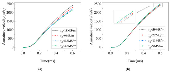 Curves of armature velocity with time at different conductivities. (a) Armature velocity at different armature conductivities σd; (b) armature velocity at different track conductivities σg.