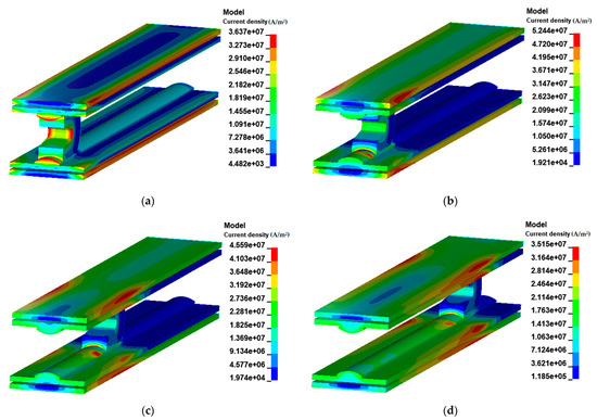 Current density distribution at different time points. (a) t = 0.10 ms; (b) t = 0.25 ms; (c) t = 0.40 ms; (d) t = 0.55 ms.