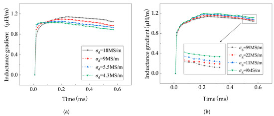 Inductance gradient curve with time at different conductivities. (a) Inductance gradient at different armature conductivities σd; (b) inductance gradient at different track conductivities σg.