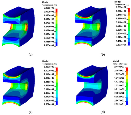 Temperature distribution at different time points. (a) t = 0.10 ms; (b) t = 0.25 ms; (c) t = 0.40 ms; (d) t = 0.55 ms.