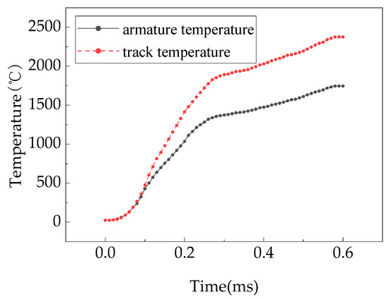 The temperature curves of the armature and track are calculated by LS-dyna as shown in Figure 10.