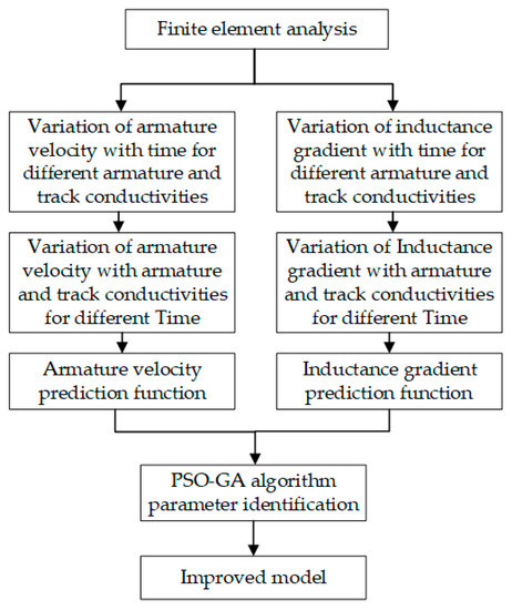 In the available finite element calculation of the armature velocity and inductance gradient, the conductivities of the armature and track are usually considered as constant. However, in the actual launching process, the armature and track will produce a high temperature rise gradient due to the high frequency current, which causes the change of conductivity and affects the current diffusion, the armature velocity and the inductance gradient. In summary, this paper establishes an improved model by using a parameter identification method. Firstly, multi-group calculations of the armature velocity and inductance gradient are carried out by changing the conductivity values in the finite element analysis software Ls-dyna. Then, the prediction functions for the armature velocity and inductance gradient are obtained according to variation rules of the armature velocity and inductance gradient with conductivity values. Finally, the improved model of electromagnetic-thermal coupling is obtained by parameter identification. A flow chart of the establishment of the improved model is shown in Figure 11.