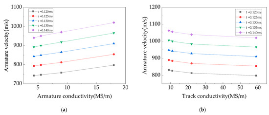Based on the data obtained from Figure 5, the armature velocity relations with the armature conductivity and track one at different times are obtained, which are shown in Figure 12.