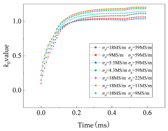 It can be seen that, when the track conductivity σg is fixed, the inductance gradient increases with the armature conductivity σd. This is due to the fact that the greater armature conductivity σd causes a more uniform magnetic field distribution, and a larger inductance gradient. Conversely, the inductance gradient decreases with the increase of the track conductivity σg. This is due to the fact that the greater track conductivity σg increases the skin depth, which reduces the diffusion speed of the magnetic field in the track. Thus, the inductance gradient decreases.