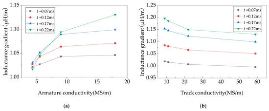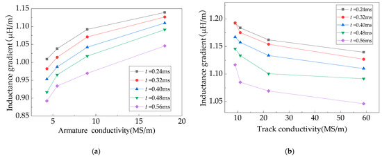 In the declining stage, the inductance gradient relations with the armature conductivity and track one at different times are obtained, which are shown in Figure 16.