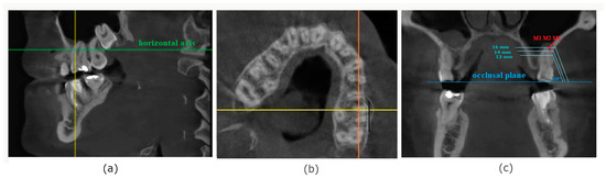 Measurement of bone depth on CBCT scans: (a)—sagittal slice consisting of mesiobuccal root of the first permanent molar used to obtain horizontal slice; (b)—horizontal view of the maxilla rotated in relation to the coronal axis to obtain a cross-section of the alveolar process at the level of M1; (c)—measurement of IZC thickness in modified coronal view.