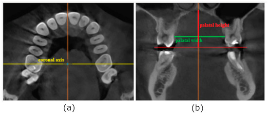 Measurement of modified palatal height index: (a)—horizontal slice used to obtain coronal view, (b)—measurements of the palatal width and height.