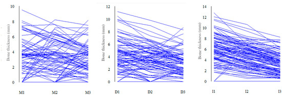 A parallel coordinate plot presenting bone thickness at the level of the mesial root of the first molar (M1, M2, M3), the distal root of the first molar (D1, D2, D3), and the interdental space between the first and the second molar (I1, I2, I3).