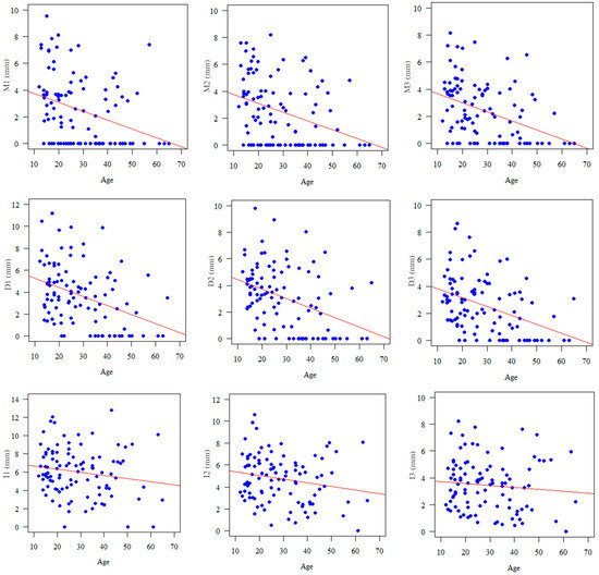 According to Spearman’s correlation coefficient test, there was a significant and negative correlation between the bone thickness and the age in the case of measurement points M1, M2, M3, D1, D2, and D3 (Table 9). In points I1, I2, and I3 the correlation was also negative, but statistically insignificant. Results are also presented in Figure 4.