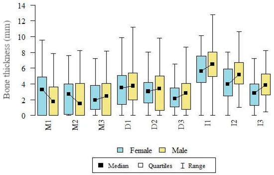 Considering differences in bone thickness among sexes, bigger values were observed in the case of male patients, but the only significant differences were found in the I2 and I3 measurements. Similarly, Santos et al. [19] and Amri et al. [18] did not find any differences in the bone thickness buccally to the distal and mesial root of the maxillary first molar respectively, comparing sexes.