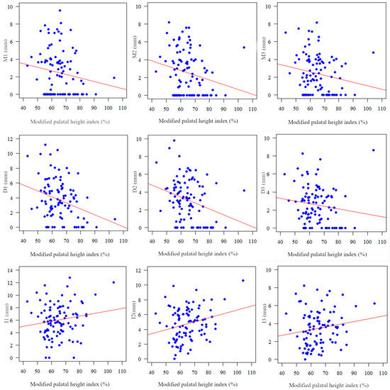 A significant and negative correlation between bone thickness and modified palatal height index was found in the case of points M1, D1, and D2 (Table 11, Figure 6). Nevertheless, it can be observed that bone depth tends to decrease with the increase of modified palatal index when areas buccal to the first molars are analyzed, and increase when interdental area is taken into consideration.