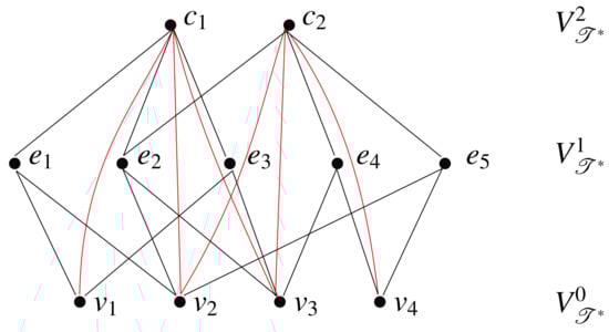 Example of the graph associated with the mesh shown in Figure 1. The edges in the graph are presented by black or red lines. The edges between cells and vertices are highlighted in red.