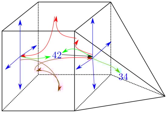 where the and are auxiliary connections enabling direct iteration over cell boundaries. The are pointers from each cell to one of its faces, while the references are between the faces, and they connect the faces making up the boundary of each single cell. Other connections are defined according to Equation (4). For better understanding of the connections between the elements, see Figure 3 presenting connections in a 3D mesh.