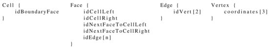 The complete C++ data structure storing a mesh consists of arrays containing the mesh elements. The representation of a mesh element is to be understood as a simple C++ data structure containing the respective references from (10). An example for the dimension is depicted in Figure 5. In addition, the structures for cells and faces contain two auxiliary data elements: center (see Section 4.3) and flag.
