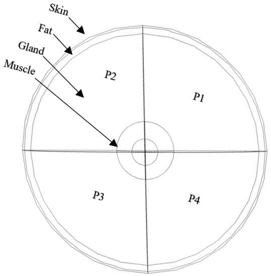 There are four layers in the breast and tumor, so there are five values for I, which are as follows: muscle, i = 1; gland, i = 2; fat, i = 3; skin, i = 4; and tumor, i = 5. In addition, there are two other variables: blood perfusion rate, , and thermal conductivity of the tissues, , as well as the specific mass, , the specific heat, , and the arterial temperature of the blood, Tb. Furthermore, in each tissue layer, there are metabolic heat generation, , and temperature, Ti.
