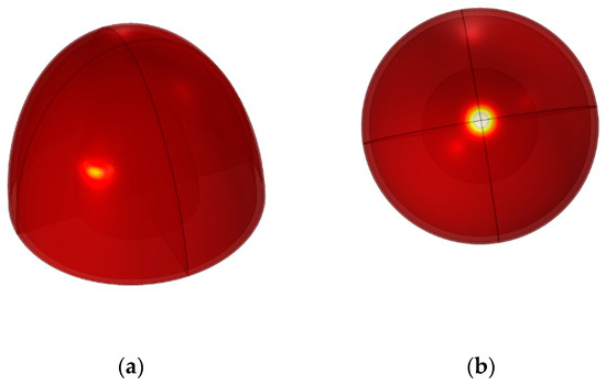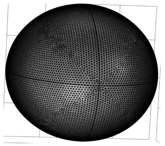 The heat transfer system is depicted in Figure 1, Equation (1), and their associated boundary conditions were solved by utilizing COMSOL Multiphysics 5.3 software. Moreover, the sizes and properties of the tissue are listed in Table 1. COMSOL’s bioheat transfer system was used to simulate thermophysical properties and boundary conditions. Extra fine mesh size was used because it was appropriate for breast tissues with a high density of the breast. A previous study proposed estimating breast tumors from surface-level temperature changes by relying on theoretical calculations that employ some form of the optimization process to identify tumor characteristic features such as depth, size, heat generation, thermal conductivity, and blood perfusion. However, such features were typically estimated based on a variety of other thermal conductivities of cancer and healthy tissue. In Figure 2, the hemispherical 3D breast model is represented numerically by a mesh. Breast tissue is composed of multiple layers. The thermal model of the breast was analyzed in various scenarios in this project. The surface temperature on the breast skin was reviewed first, followed by the change in temperature between tumor cells and healthy breasts. Finally, the normalized temperature changes were evaluated.