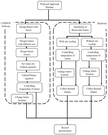 For several researchers, such as [15], thermography has been used as a diagnostic technique in the detection of tumors in young patients. Additionally, a relation between breast heat transfer and the age of the patient was suggested. Furthermore, the mathematical calculation was conducted by using the commercial Computational Fluid Dynamics application FLUENT, along with the bioheat Pennes equation, which utilized the finite element method. Moreover, the inverse heat transfer problem was solved using sequential quadratic programming to determine the thermal conductivity and blood perfusion of breast tissues and cancers. The data confirmed through the implementation of the research technique demonstrated that thermophysical properties can be estimated using infrared images. Finally, the empirical correlation between breast thermal conductivity and patient age provided a satisfactory response for the cases analyzed. Studies conducted by [16] refer to the use of numerical simulations of breast cancer using the Pennes equation and COMSOL software to analyze the temperature change of breast surface and factors that affect temperature variation. In addition, two locations of cancer were used in the breast, with depths of 4.5 cm and 5.5 cm. Moreover, normal- and high-density breast tissue were specified with tumors with different sizes of 1 cm, 1.5 cm, 2 cm, and 2.5 cm. In addition to simulating breast layers, perfusion rate, density, and the specific heat capacity of the blood were also simulated. The results indicated that the temperature range changed on the surface of the breast from 0.1 °C to 1.41 °C.